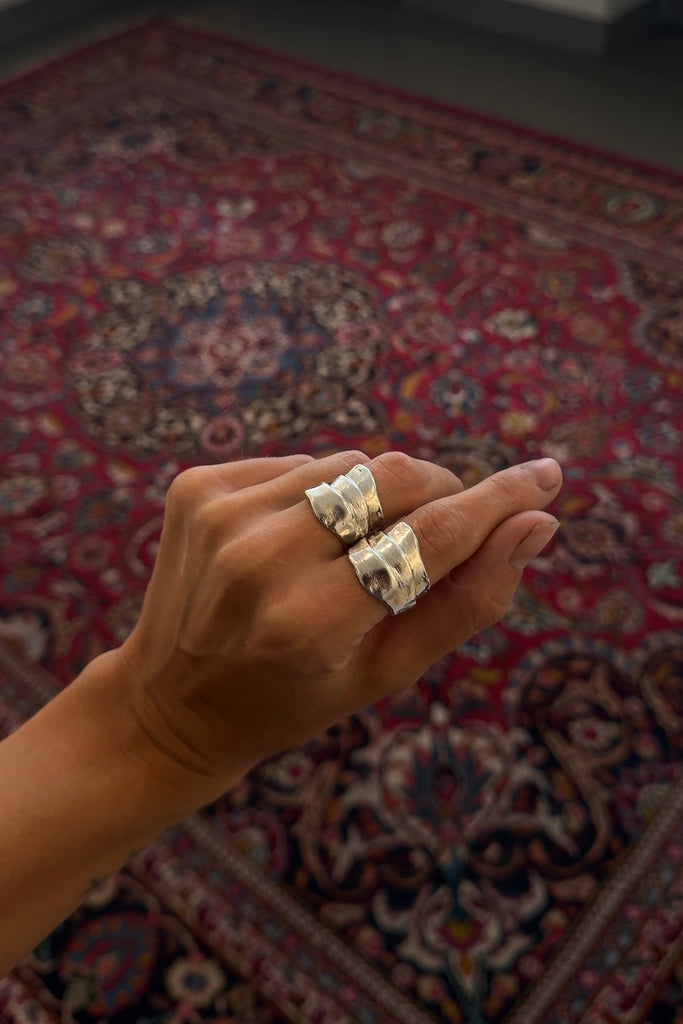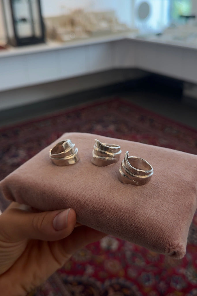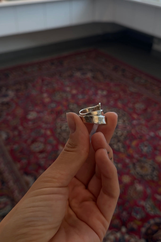 Bold and weighty, this silver ring folds around the finger like a shell. Sculptural and imperfect, it feels both protective and exposed - a piece that shields even as it draws the eye.