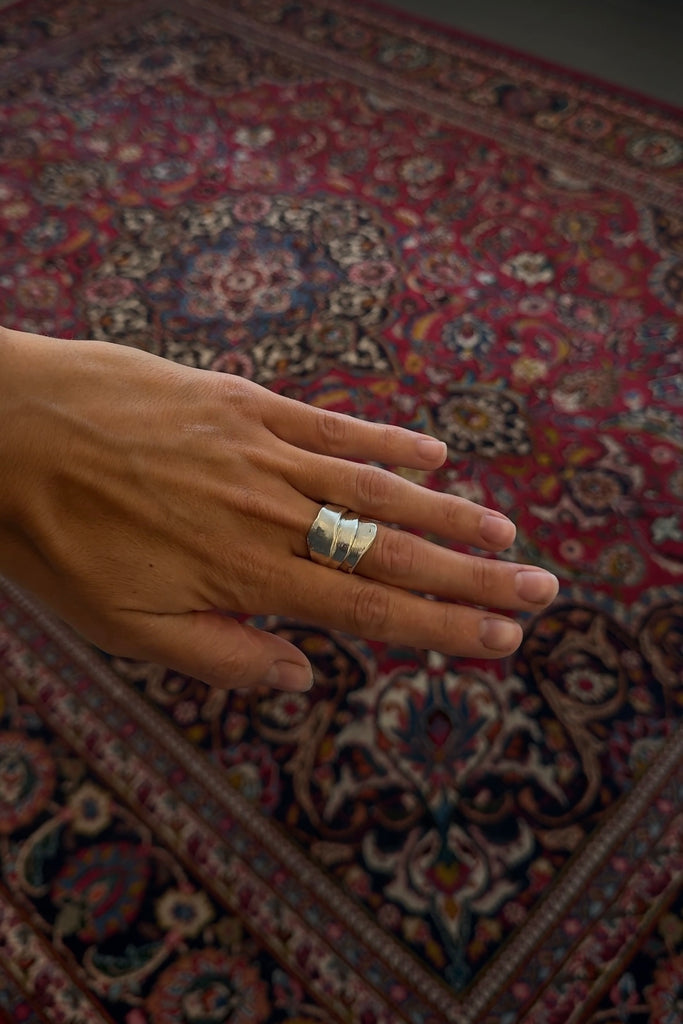 The very first Carapace ring was sculpted by hand in wax, cast in silver, and became the original form. From that piece, a mold was made - allowing me to cast new rings that carry the same shape as the first. Each one is still finished by hand, shaped and refined in subtle ways that make every ring similar, but never completely alike.