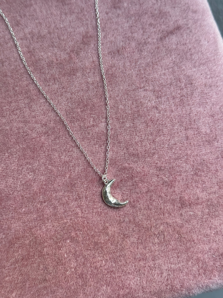 The very first Moonie piece was sculpted by hand in wax, cast in silver, and became the original form. From that piece, a mold was made - allowing me to cast new pendants that carry the same shape as the first. Each one is still finished by hand, shaped and refined in subtle ways that make every piece similar, but never completely alike.